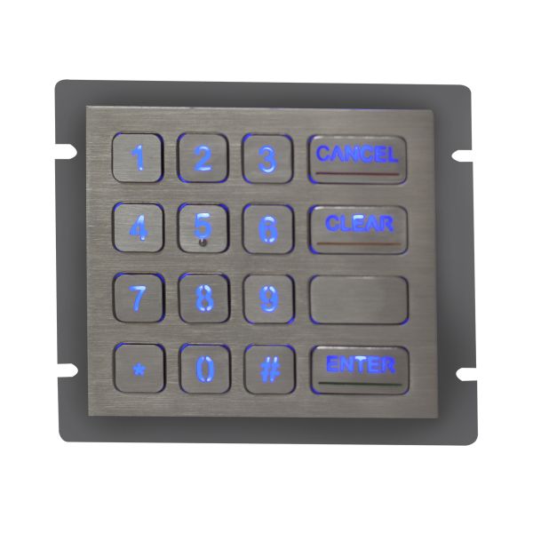 16 keys compact format IP66 dynamic vandal proof Stainless Steel industrial numeric keypad with fully sealed & ruggedized industrial metal dome PCB with industrial electronics controller shielded and protected by stainless steel housing, industrial metal dome PCB with gold-on-gold key switch technology with short stroke 0.45mm with excellent tactile feeling for stable and accurate data input, stainless steel key caps etched out via special professional way and filled with transparent epoxy for backlight out, with industrial backlight included (Red/blue/white/green optional), rear panel mounted.Which is good for outdoor application with direct rain and very harsh environments with humidity, much dynamic water, oil, dirt, salt mist etc, no rust risk and anti-salt spray corrosion. Dimension: 100.0mm x 90.0mm (front panel)