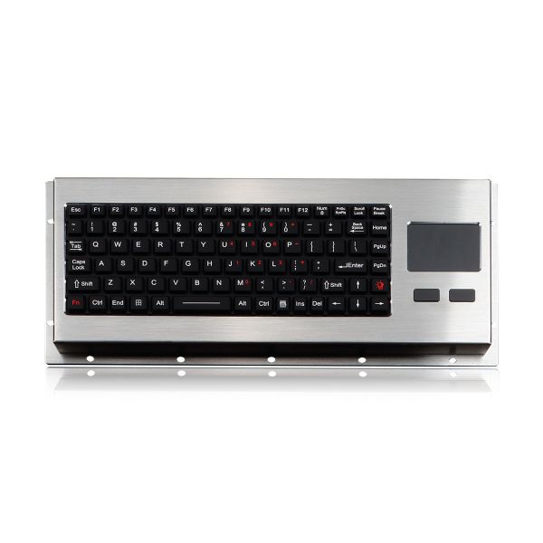 DESCRIPTION: 91 keys IP68 dynamic sealed & ruggedized silicone rubber military keyboard with sealed tough touchpad for fast cursor position, with 2 extra mouse buttons for left and right clicking, 12 function keys on top line for easy operation, with carbon-on-gold key switch technology with long stroke (1.50mm) with extremely good tactile feeling for fast and accurate data input without any noise, with durable coating & antimicrobial keyboard surface withstand to most chemicals and liquids under harsh environment, desk top version with stainless steel metal housing or rear panel mount solution wtih mounting holes along the edges of stainless steel back plate, adjustable white or red backlight included. FN + bulb button to control keyboard backlight on or off. Military level, built to meet MIL-STD-461G (EMC, EMI, EMS, ESD) and MIL-STD-810F (wide temperature, shock, salt mist, vibration, fungus, humidity).